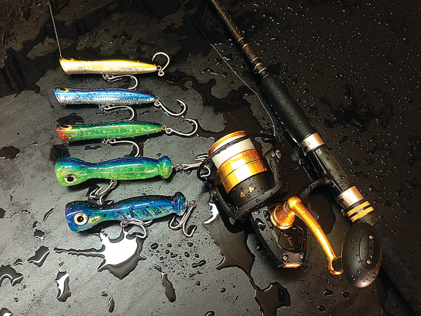 At times, undersize or oversize chuggers — compared with the local forage — do the trick. However, consistent success generally comes by matching the size of the plug to the baitfish most abundant in the area. The philosophy of using brighter plugs on overcast days and darker colors on bright days for the silhouette effect does indeed have merit, but I prefer mimicking the color of the local bait most of the time — we could be trying to fool fish on a selective feed. Yet, when strikes are slow to come, I experiment by switching to a smaller or larger plug and altering the retrieve.