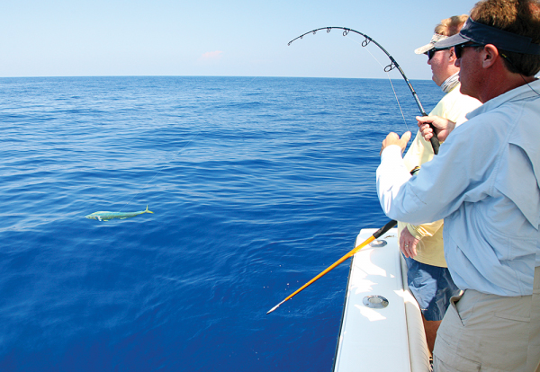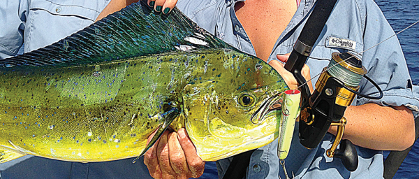 Dolphin are curious fish, similar to cobia and amberjack over shallow wrecks. When we approach a board or a patch of weeds, we’re set to present a live bait or fresh ballyhoo on a 20-pound-class spinner to a large dolphin, or a chugging plug to school fish. Even when a floating object or weed patch harbored no fish, I’ve seen the chugging plug call them in after only a few casts.