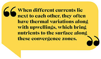 Productive zones often occur along a water-surface-temperature break. Such a break signifies either two different water masses (water types with different densities), the infiltration of a warm-water finger or filament, an eddy, or an upwelling that pushes deep layers of cool water toward the surface. When different currents lie next to each other, they often have thermal variations along with upwellings, which bring nutrients to the surface along these convergence zones. And, in turn, these often result in plankton blooms which, if stable, establish mini ecosystems, which draw tiny baitfish that feed on the blooms, followed by slighter larger baitfish, which feed on the smaller baitfish '’’ all the way up the line to top-tier predators.