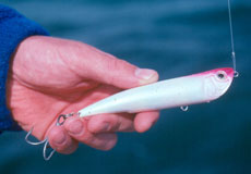 A modified topwater plug without the lead hook makes it easy to control and land small gamefish, such as this Bluefish. |
