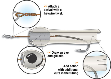 5 Finish by trimming excess leader wire and haywire-twisting the swivel to the leader. Draw eyes and gill slits. Experiment with other markings, or cut the trailing edge of the tube into flaps for added action.
