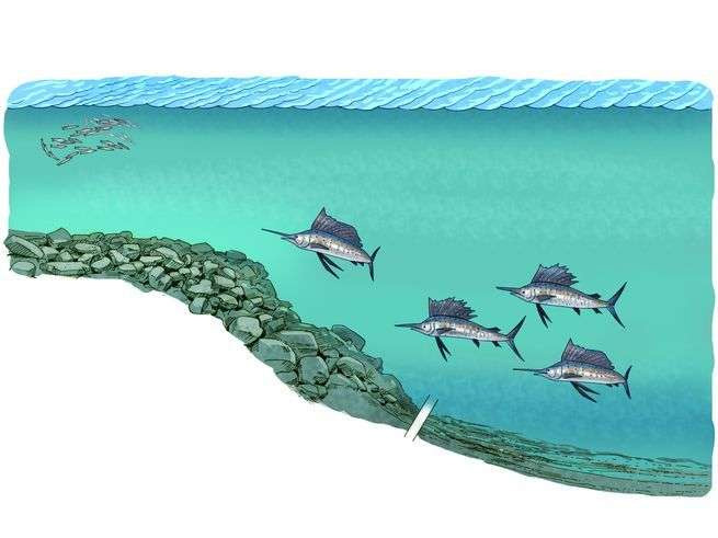 In the Florida Keys, schools of ballyhoo gather over shallow patch reefs from late fall through early spring. Packs of hungry sailfish patrol the edges looking for them, and venture as shallow as 30 feet to launch surprise attacks. Several ballyhoo jumping in unison in the same direction are the classic telltale sign.