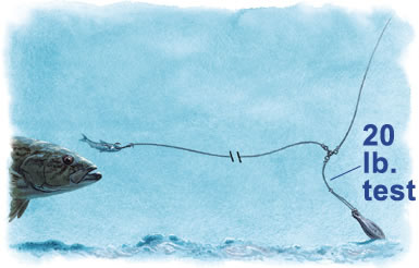 This is a good rig to use with weights heavier than 16 ounces and for fishing over heavy structure. The main line is tied to one eye of the swivel and a long leader is tied to a second eye. The weight, usually a bank sinker, is connected to the third eye of the swivel via several inches of lighter line. In my case it's 20-pound test.