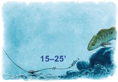 This rig boasts many of the same advantages as the in-line version when using a long leader, plus the heavy sinker won't chafe the fishing line. Furthermore, should the rig snag on the bottom, it can usually be freed by locking down the drag and winding tight until the lighter line holding the sinker parts.