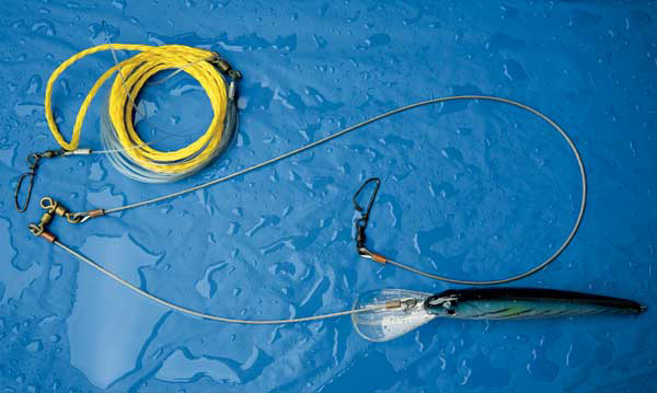 Using a deep-diving swimming plug to take a dredge into the depths is a smart and effective alternative to a trolling lead. Rigged properly, the swimming plug can attain depths greater than a trolling weight due to the action of its lip. What's more, instead of a lifeless lead weight in front of the dredge, you now have an attractive, large "baitfish" that appears to be scrambling for its life ahead of the pack. There's virtually no weight to it, making it a snap to handle, and its plastic body is gelcoat friendly. And you won't lose sleep over a wahoo stealing the swimming plug because it's attached with heavy cable; odds are it will survive to tease fish again and again and again.
