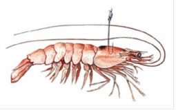 1 If you intend to drift your shrimp in the current or suspend it below a float rig or popping cork, you'll want to take advantage of its natural kicking action, which often pushes the strike button of many game fish. The best way to do this is to hook the shrimp through its carapace. However, it is important to avoid the shrimp's stomach and pancreas, which appear as two translucent dark spots. In version one, the hook is threaded crosswise through the carapace, just under the tip of the shell.