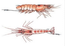 2 In version two, which will provide more casting distance and make the shrimp easier to retrieve, the hook point is threaded under the "chin" and exits through the center of the carapace, just behind the "horn" and between the vital organs. When hooked in this way, the shrimp won't live as long as it would if hooked crosswise through the carapace.
