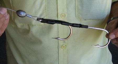Step 2: Slide an egg sinker and a crimp sleeve onto six feet of 480-pound-test 49-strand cable. Pass the end of the cable through a pre-rigged, two-hook rig and crimp the cable with the sleeve. This two-hook rig consists of two 10/0 hooks connected by crimped 980-pound cable covered with heat-shrink tube.