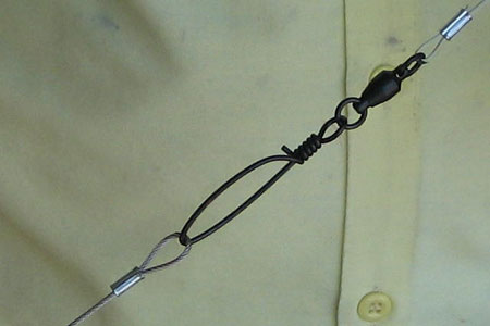 Step 5: Make up a 30- to 50-foot-long shock leader of 300-pound mono with a loop crimped in the leading end and a loop with a 200-pound ball-bearing swivel with a coast-lock snap in the trailing end. Clip this swivel to the leading end of the terminal leader. Attach the leading loop of the 300-pound leader to the trailing-end swivel of the trolling lead.