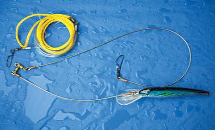 Rigged with a Mann's Stretch 40, or Rapala X-RAP Magnum 30 deep-diving plug, the dredge can attain a depth well beyond sight. Before deploying the system, tie off the end the dredge line (roughly 30 to 40 feet of 400-pound-test monofilament) to a transom cleat; tying in a three-foot section of nylon rope at the end of that line makes for easy handling. Next, put the boat in neutral, lay the dredge and swimming plug in the water, put the boat back in gear, and maintain a slow crawl until the dredge is in position. Then cleat the line, and resume trolling speed.