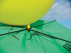 "Attaching a helium balloon to a fishing kite can be cumbersome," says Liederman. "It used to be that you'd have to use floss to center the balloon to the backside of a kite and then tape it in place. Sometimes the tape would stick and you'd pop the balloon as you tried to peel it off. It took time to balance the balloon and secure it properly. Then if it wasn't set just right, you'd have to peel off the tape, undo the floss and start all over. The Kite Thong simplifies the entire procedure. It offers a fast, easy, durable way of securing a helium balloon to a kite '’’ the first time. It also gives you the ability to fine-tune the kite to steer right or left by a simple thread adjustment. It's just so easy and functional."