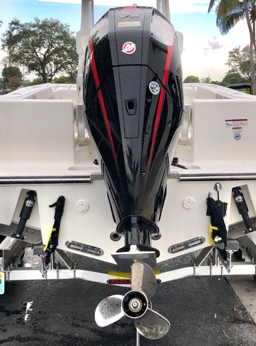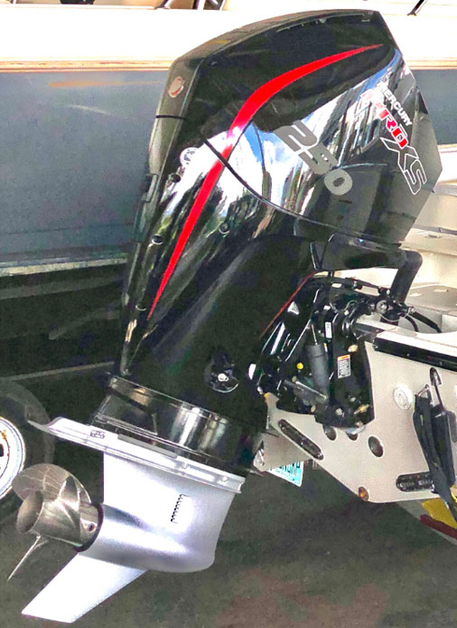 POWER & DELIVERY - A Mercury 250hp ProXS V8 outboard, according to George, "is the perfect match for this boat." The torque from the V8 powers the fully-loaded hull onto plane in quick order. It delivers instant performance when running rough inlets or controlling strong currents. The torque can be felt throughout its full RPM range. Mercury's VesselView 504 keeps all pertinent outboard information in plain view.