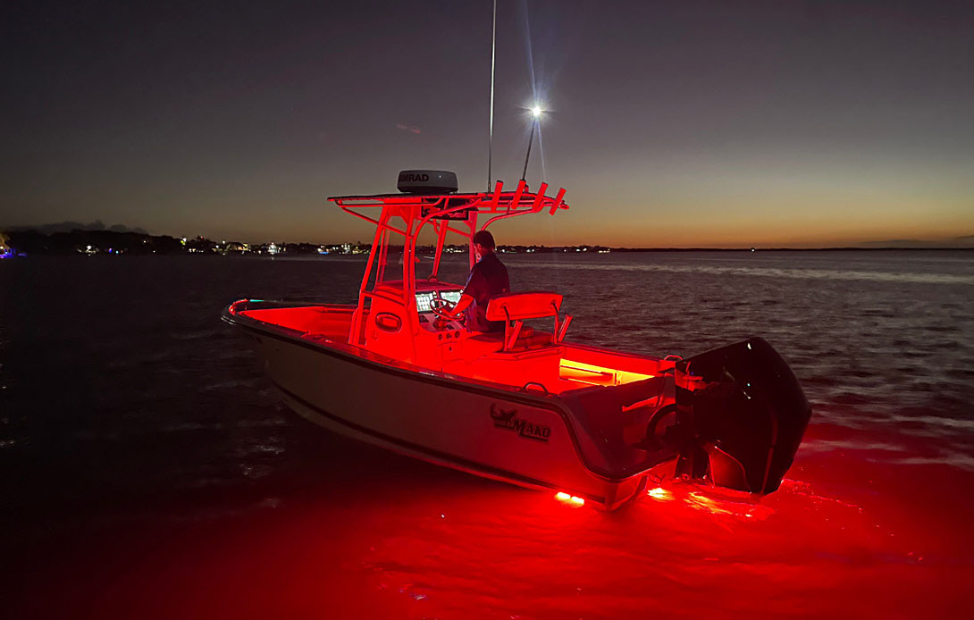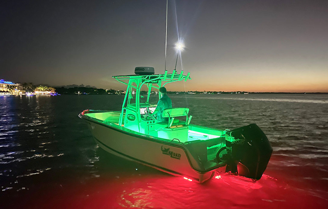 On board are six Multi-Color RGB Courtesy Lights, two full color Spreader Beam Flood Lights, two full color, eight-foot long RGB Accent Lighting LED Strips, two Full Color Down Lights with White Housing and Lenses, and two Round RGB Submersible Accent Lights (live well).