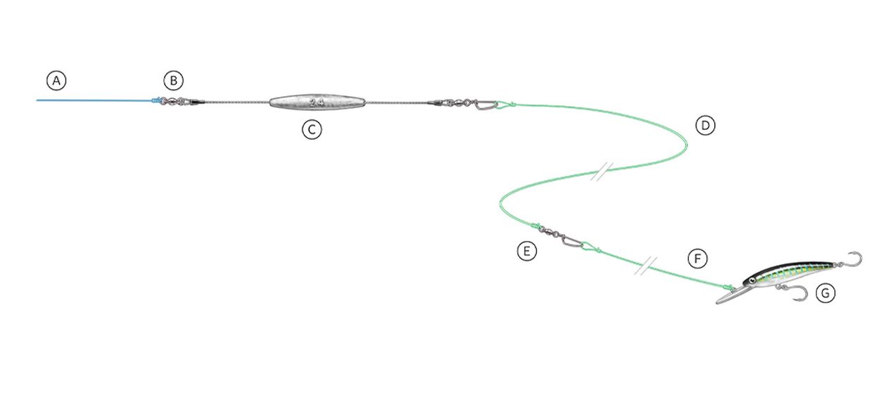 [A] Main line [B] Ball-bearing swivel [C] 24-ounce trolling sinker with stainless cable leads [D] 30 to 40 feet of 100- to 150-pound monofilament [E] Ball-bearing snap swivel [F] 10 feet of cable for toothy species, mono otherwise [G] Mag 40-style swimming/diving lipped plug Steve Sanford |