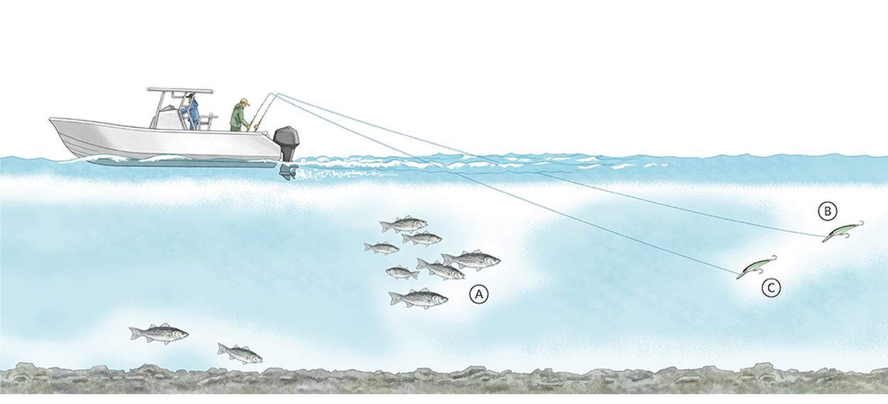 [A] Find fish holding at middepth with the sounder. [B] Rapala Mag 40 or similar deep diver. [C] Shallower diver, set slighty back. Steve Sanford |