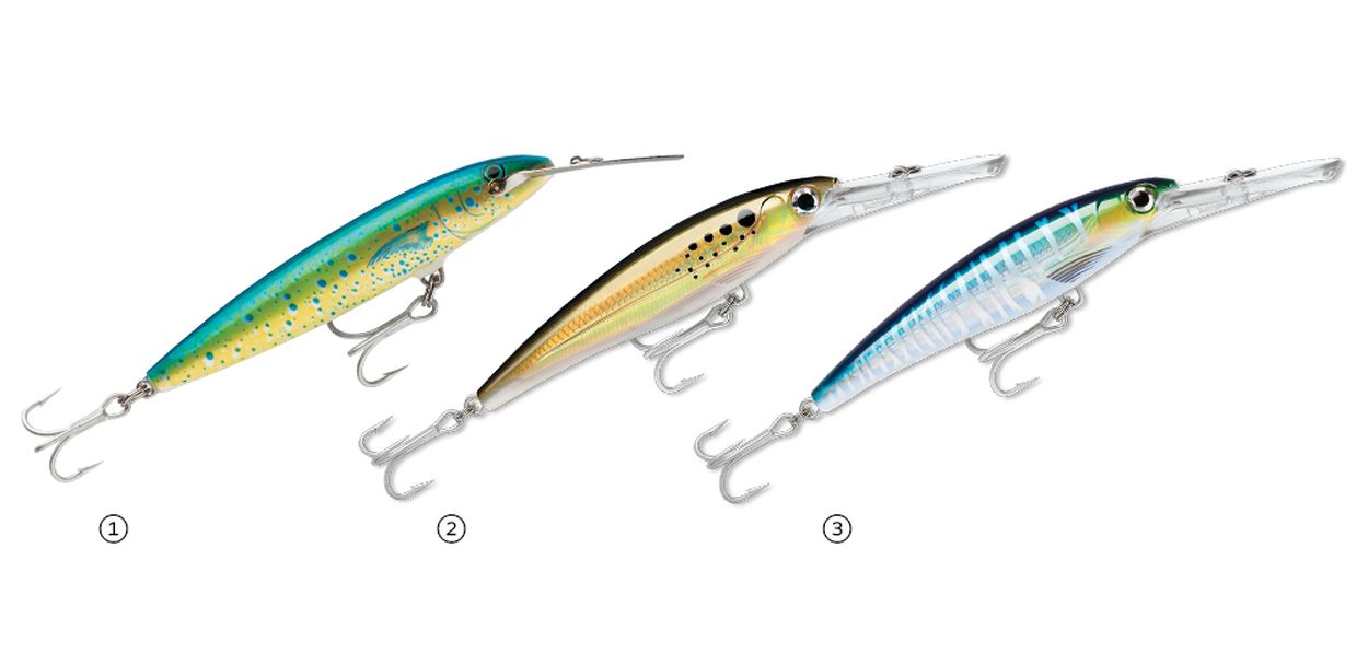| PLUGGIN' OFFSHORE Swimming plugs know no boundaries; they're deadly offshore, nearshore and within bays and sounds. Positioning them where the fish are is of utmost importance. However, size does come into play. On the Islamorada and Marathon humps in the Florida Keys, and other zones where blackfins congregate, trolling a pair of medium-size swimming plugs is a fast way to catch 5- to 10-pound-class tuna. The Rapala CD Mag 14, regardless of color, is an ideal size. Fine-tuning requires 30-pound fluoro leaders, positioning them approximately 150 and 200 yards back, and maintaining 10 knots. When one rod sings, keep the boat moving until another fish clobbers the other plug. Back up Jersey way, Capt. Joe Trainor trolls the 30- and 40-foot divers on 175-pound monofilament leaders some 100 to 130 feet back and at around 6½ knots. “We troll them for yellowfins, bluefins and bigeyes,” Trainor says. “We troll two plugs when bigeyes are around, and a single for other species. We pull them off flat lines, up close so they don’t mess with the rest of the spread. Makos love them, as do wahoo.” When trolling natural baits offshore at around 8 knots, I’ve been adding a diving plug straight off my transom, where it swims behind and just underneath the fading prop wash. Again, color doesn’t seem as important as placement; I’ve pulled them with success in purple, a mahi pattern and a few other hues. That outfit has done well with dolphin and wahoo. And this past summer with South Florida radio personality Paul Castronovo aboard, a blue marlin whacked at it a few times; it never got hooked, unfortunately, but it proved game fish do know it’s there. |