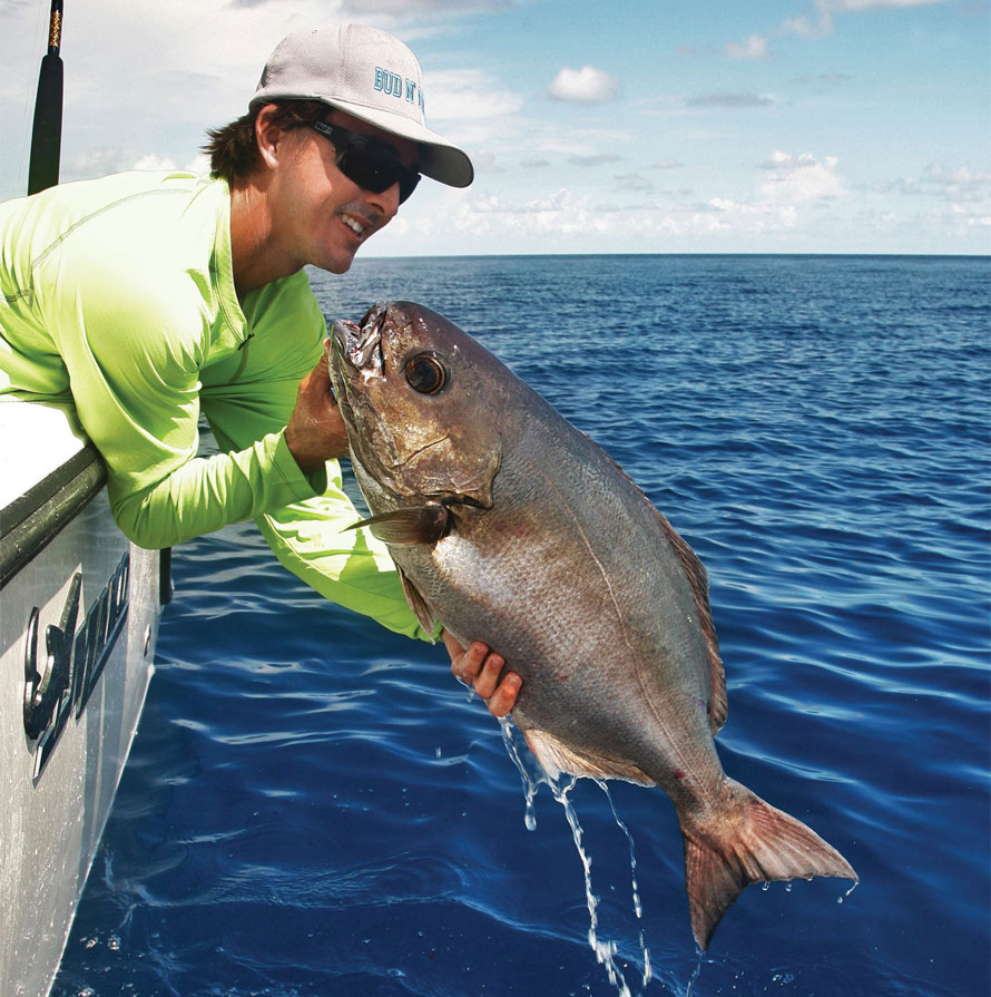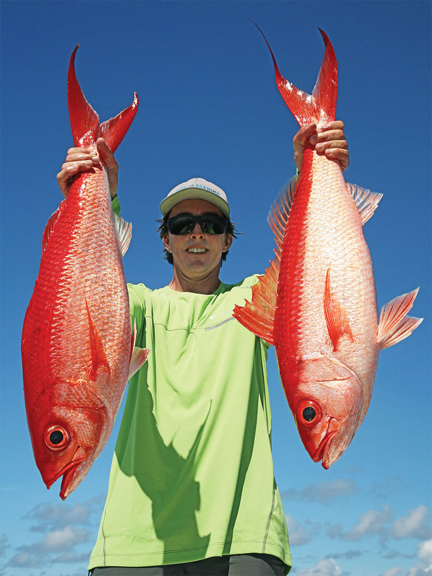| Payoff: Proper technique brought these deepwater queen snapper into the boat. The idea is to always counter the influence of a strong current or wind on the bait and keep it in position. The boat is aimed into the current with enough throttle applied to stem the current and remain over that piece of bottom. In addition, based on the type of structure or bottom composite, a little throttle reduction lets the boat creep slowly back to probe fresh areas. This “crabbing” style of power drifting catches virtually everything that swims near the bottom. |