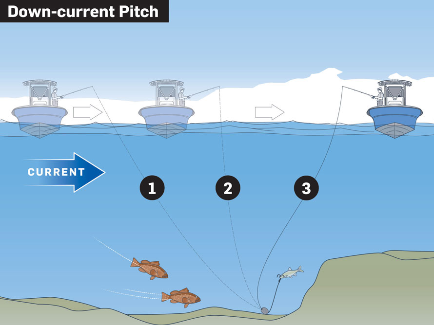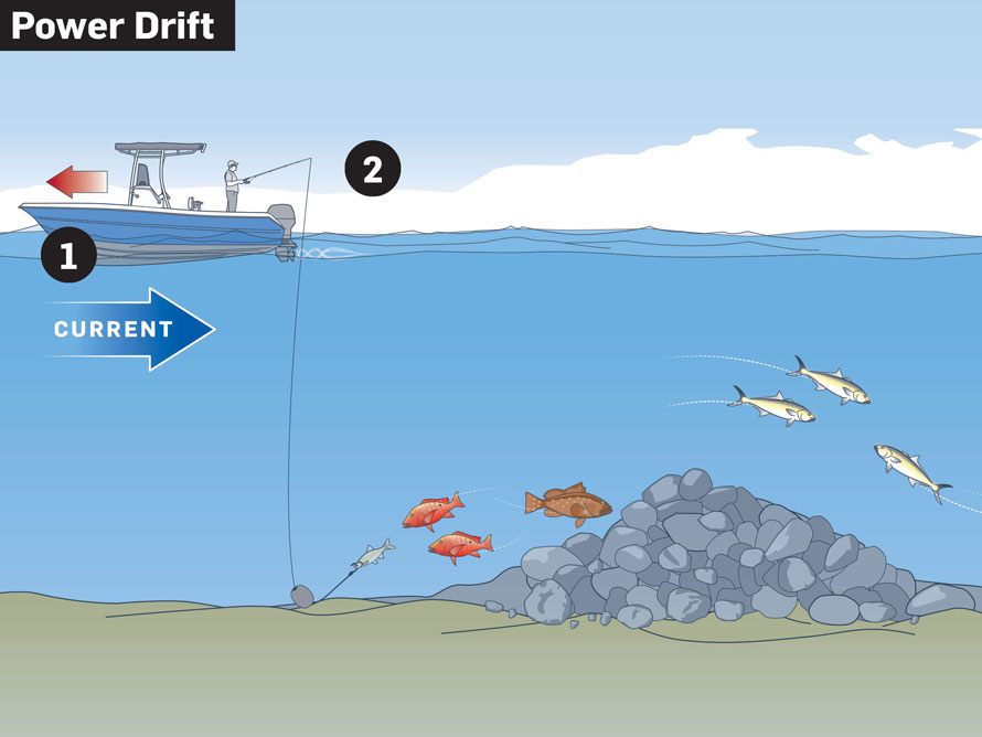 | Down-current Pitch 1. Cast the bait down-current or downwind to the target structure. 2. Gradually take in line as the boat continues its drift. 3. Pay out line slowly as the boat drifts away from the target zone. Again, the objective is to provide a bait with the maximum amount of soak time in one spot without skipping across the bottom at the pace of the boat. It’s “spot probing,” and it shines when pitching bait down-current into forage schools of menhaden or mullet, and letting that bait settle underneath those schools in the realm of game fish stalking them, be it striped bass, snook, cobia, shark or tarpon. Also, casting down-current to a wreck and letting a bait soak on the bottom along one of its sides or its front section — as the boat drifts toward it — continues to log cobia, grouper, snapper and even snook catches. Power Drift Controlled drifting, or using the motor to stem the current and remain in one spot, is excellent for precision fishing in tight confines along the bottom and increasing bait soak time. Examples here include specific points along a wreck, ledge, mound, rock pile or even a bridge piling. Unlike the other two tactics, in which everyone is free to fish, power drifting requires one person at the helm to keep the boat in position. However, with the advent of GPS-governed anchor systems, even the captain can grab a rod. It’s a game of precision, particularly over deep wrecks. In this situation, position the boat ahead of the structure; exactly how far is based on depth and the amount of line to be paid out. The goal: place a bait close enough to the wreck for fish to notice, yet far enough away that bigger inhabitants must swim out from the structure to get it. The more real estate between a wreck and the bait — provided you can still attract fish — the better the odds of stopping a hooked grouper or other large fish before it muscles its way back to its lair. What’s more, when power drifting up-current of a wreck, the helmsman can help an angler turn a big fish by throttling forward and away from the wreck. |
