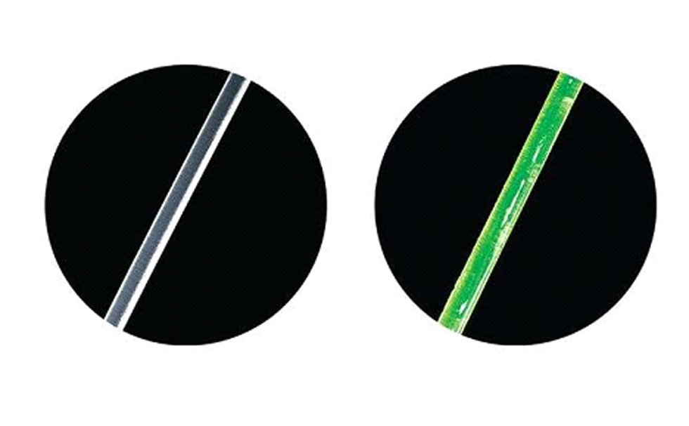 The refractive index of fluoro is nearly identical to that of water, and its diameter is smaller than nylon mono for the same pound-test; 30-pound fluoro on the left is still less visible underwater than the 20-pound mono on the right.