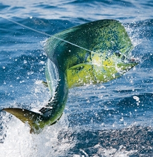 What happened next really befuddled us; the dolphin, now dull green and blue, lethargically swam into the middle of the dredge and stayed there. Appearing relaxed, it seemed content to swim among the fish strips - and it did for a minute or so. Vernon later joked that it looked like the fish was either enjoying an invigorating massage from those plastic strips or trying to breed with the fish dredge. Whatever its inspiration was, we caught the dolphin, but this required me to reel the bait ahead of the commotion and free-spool it back past the dredge. Then the dolphin lit up and consumed the bait. It was the perfect pitch-bait tactic, executed with a flat-line bait.