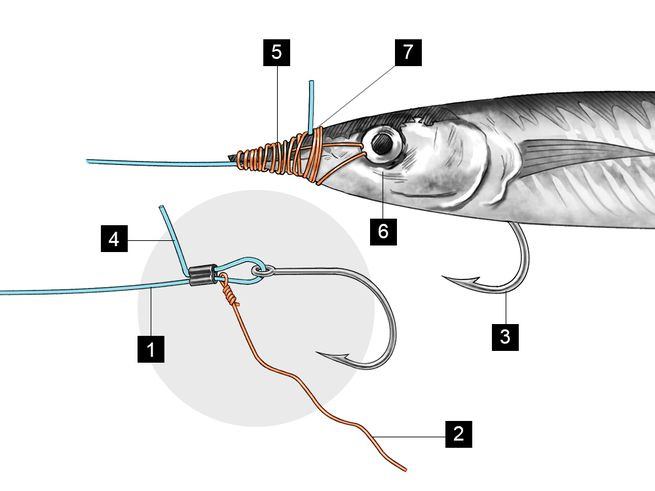 | Primarily a skipping bait for dolphin and tuna, this rig makes the hook less visible and places it at the throat of the ballyhoo for increased action. The short-shank hook may also provide less leverage for fish to throw it. It’s also a good pitch-bait setup for dolphin. Leaders and hooks are generally scaled down when rigging this way. Adding a skirt or small-diameter lure head also goes a long way in enhancing the rig’s sleekness because it further hides the hook. How It's Done 1.) Scale down leader diameter 2.) Monel or copper wire 3.) Hook emerges near ballyhoo head 4.) Leader tag passes through both jaws 5.) Break off bill and bind jaws to leader with wire 6.) Wrap wire through eye socket 7.) Clip leader tag when finished |