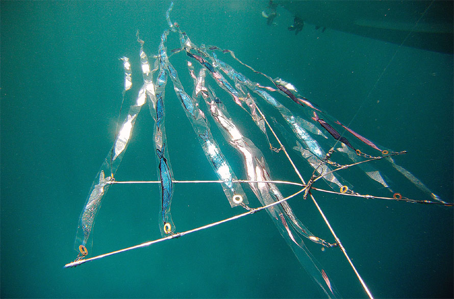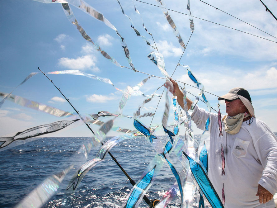 | When the Trolling Stops As noted, holographic fish dredges are not just for trolling. When fishing for South Florida sailfish, for instance, many anglers drift a full spread of live bait from kites and flat lines, and deploy at least one dredge either off the bow or amidships (based on drift). The dredge, generally a minimum of 100-plus fish, is weighted and positioned between 10 and 15 feet down; it undulates and flashes, and appears as a baitball holding tight to the vessel. Often, a second dredge is deployed, its depth staggered with the other. As the boat drifts and rocks, these holographic fish strips acquire a rhythm, moving in unison, reflecting light and attracting sailfish; as a sailfish nears the boat, it will likely eat a hooked bait or appear on the dredge where it can be pitch-baited. Should you have to chase a hooked sail, provided the boat is backing down on the fish, a close watch is kept on the now slow-trolled, bow-positioned dredge because another sail or two could easily rise to it. That same dredge/drifting tactic also pulls in blackfin tuna and kingfish. A little farther offshore, drifting a dredge while working over a school of dolphin will keep them around. It will also help to draw them to the boat when shutting down to chunk or live-bait a stretch of weeds or flying fish showers. |