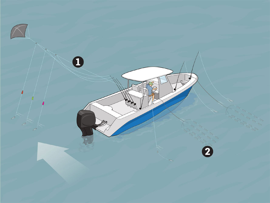 | 1. Downwind: Assign someone to manage the kite and kite baits. They require frequent adjustments. 2. Upwind: Another crew member should man the upwind lines, the dredges and have a pitch bait ready. |