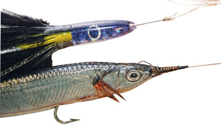 So how do you maintain the minimal visibility and action provided by monofilament nylon and fluorocarbon leaders without sacrificing the rig to those toothy predators? Consider incorporating a wire trace into your leader, fine-tuning the length of the wire so it remains hidden under the bait's beak or chin, protruding a few inches beyond its head for cutoff protection. This setup is ideal for ballyhoo, as well as trolling feathers, strip baits and lures.